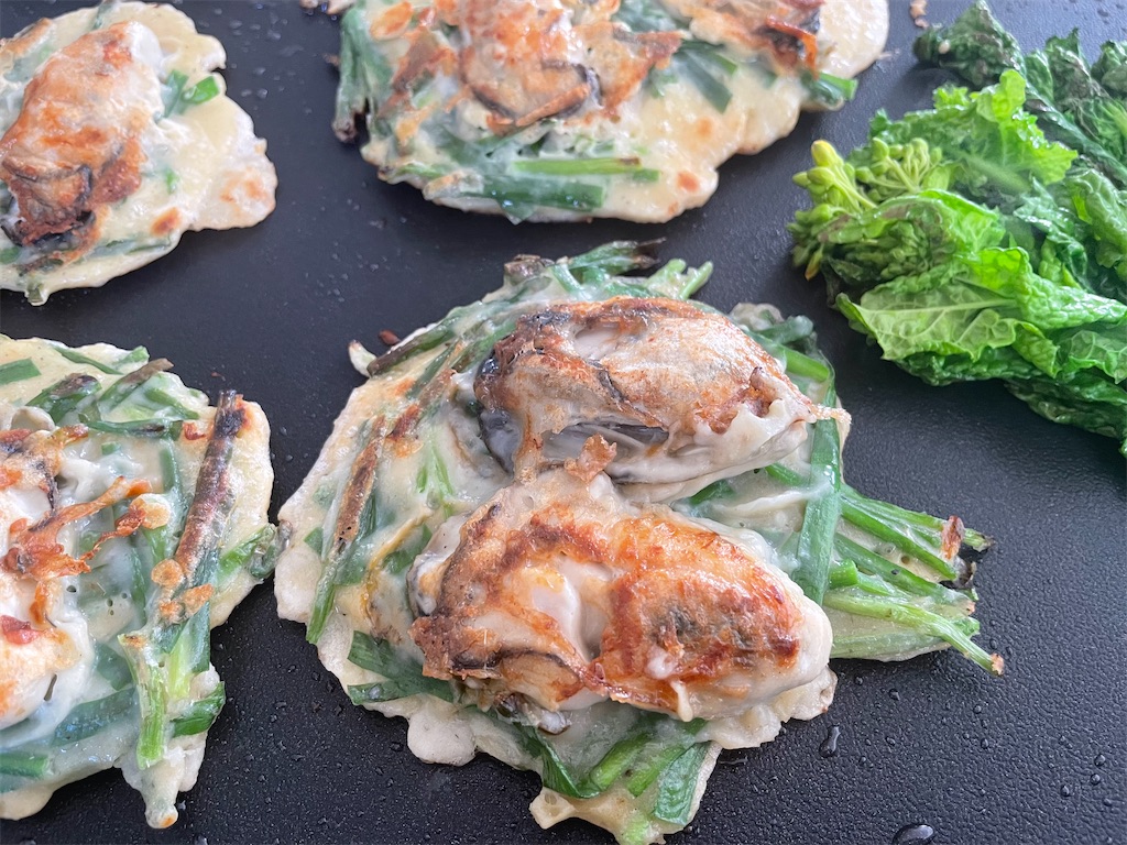 その上にニラたっぷりの生地とペーパーで水分を切った坂越の牡蠣をのせました。