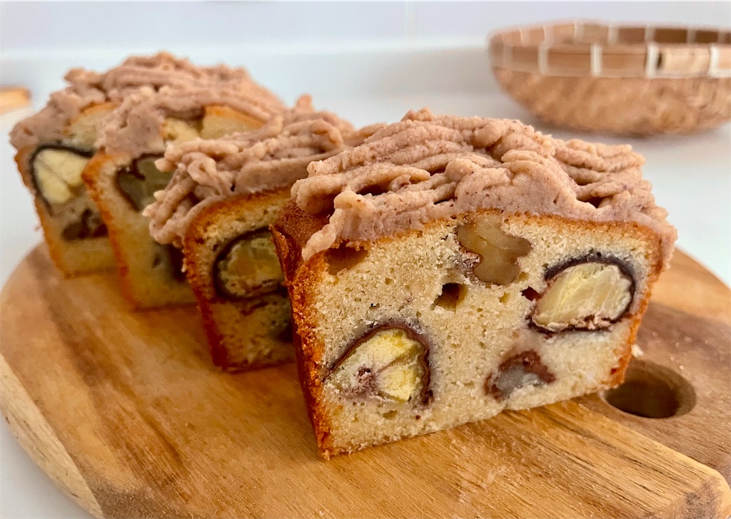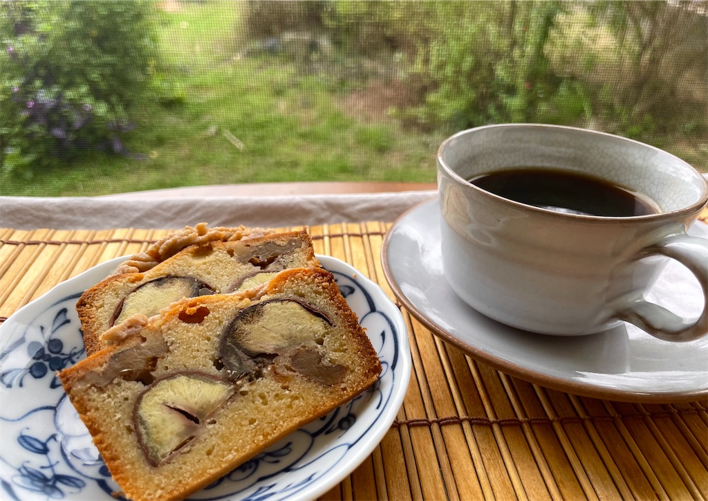 こちらは前日に焼いて置きました、バターケーキ。自家製の栗の渋皮煮6つをカットしたものと胡桃を入れてます。