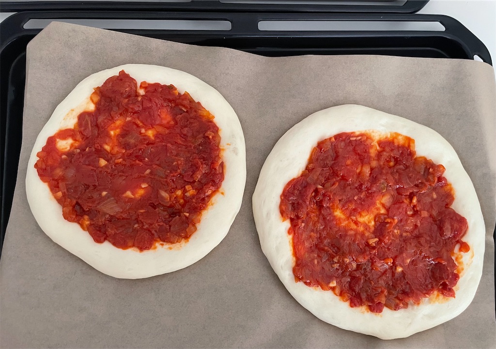 ピザソースは炒めたにんにく、玉ねぎ、アンチョビにホールトマトを加えて15分程煮詰め、仕上げにオレガノ、酢、塩を少量加えています。
