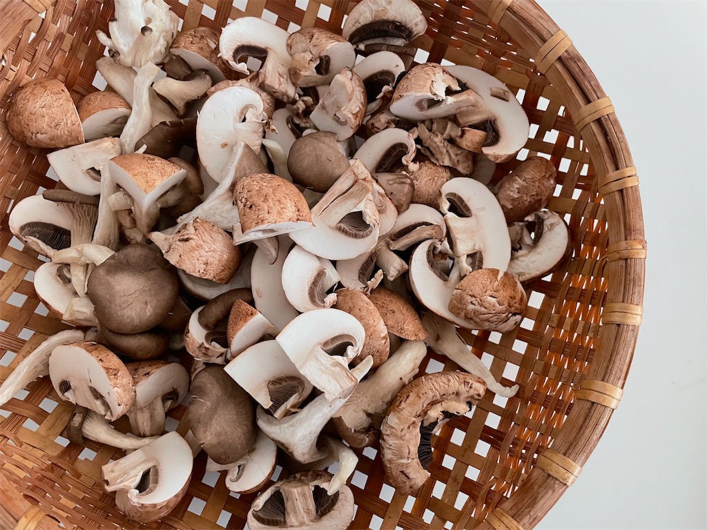 マッシュルームはペーパーで表面をきれいにして、 色々な形にカット。平茸は手で裂いて食べやすくします。