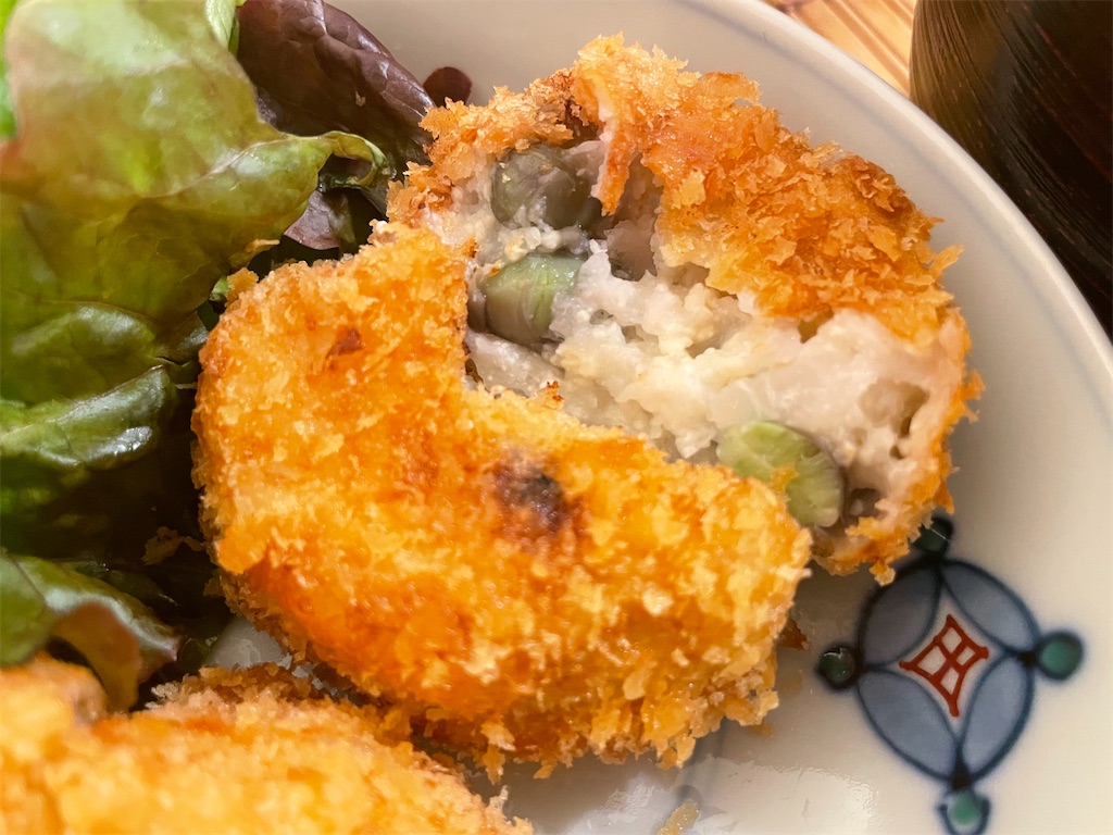 茹でた里芋を伸ばして、黒枝豆、塩、水切りした木綿豆腐をいれて丸めて揚げました。